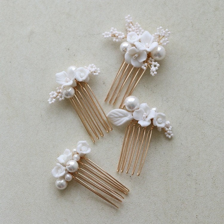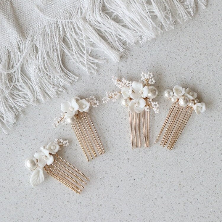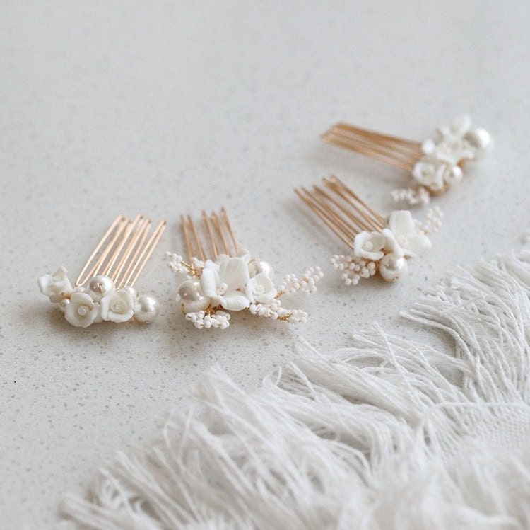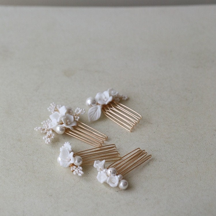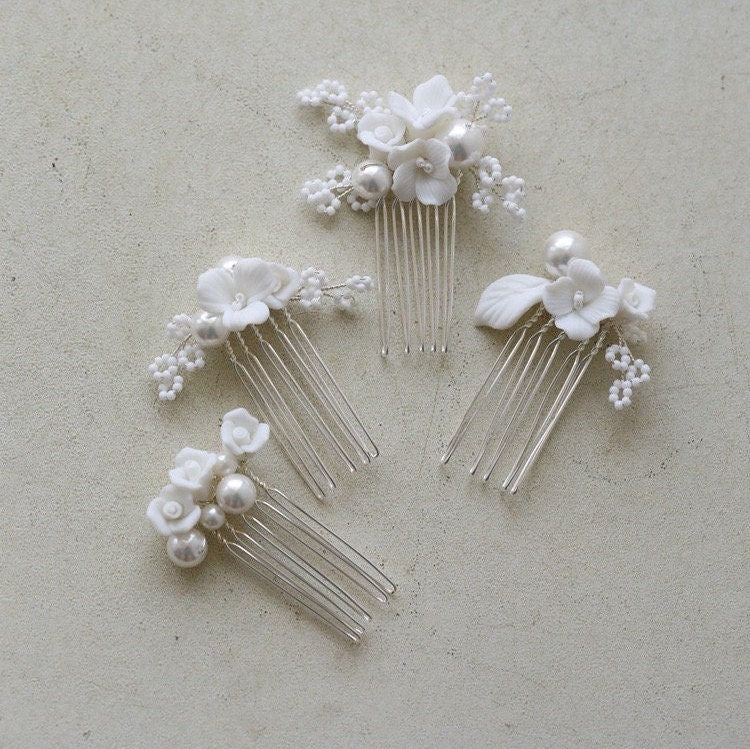 Kombinieren Sie Ihr Hochzeitskleid mit diesem wunderschönen Set aus 4 Brauthaarkämmen. Mit handgefertigten Blumen und Blättern aus elfenbeinfarbenem Porzellan, veredelt mit zarten Zweigen aus weißen, winzigen Rocaillesperlen und Perlen.