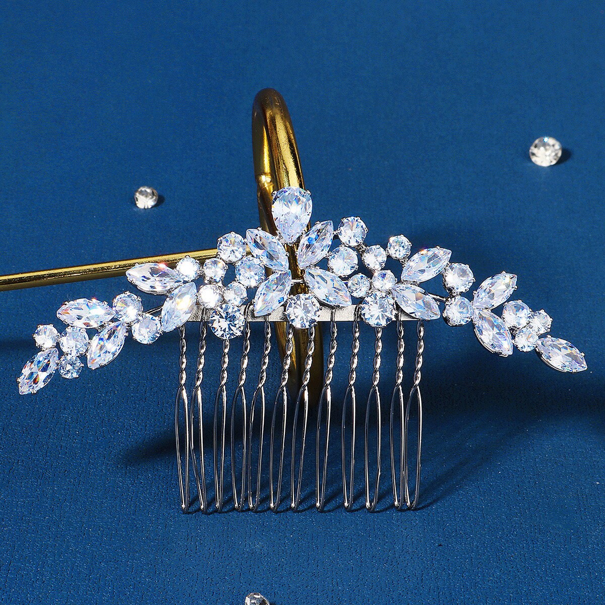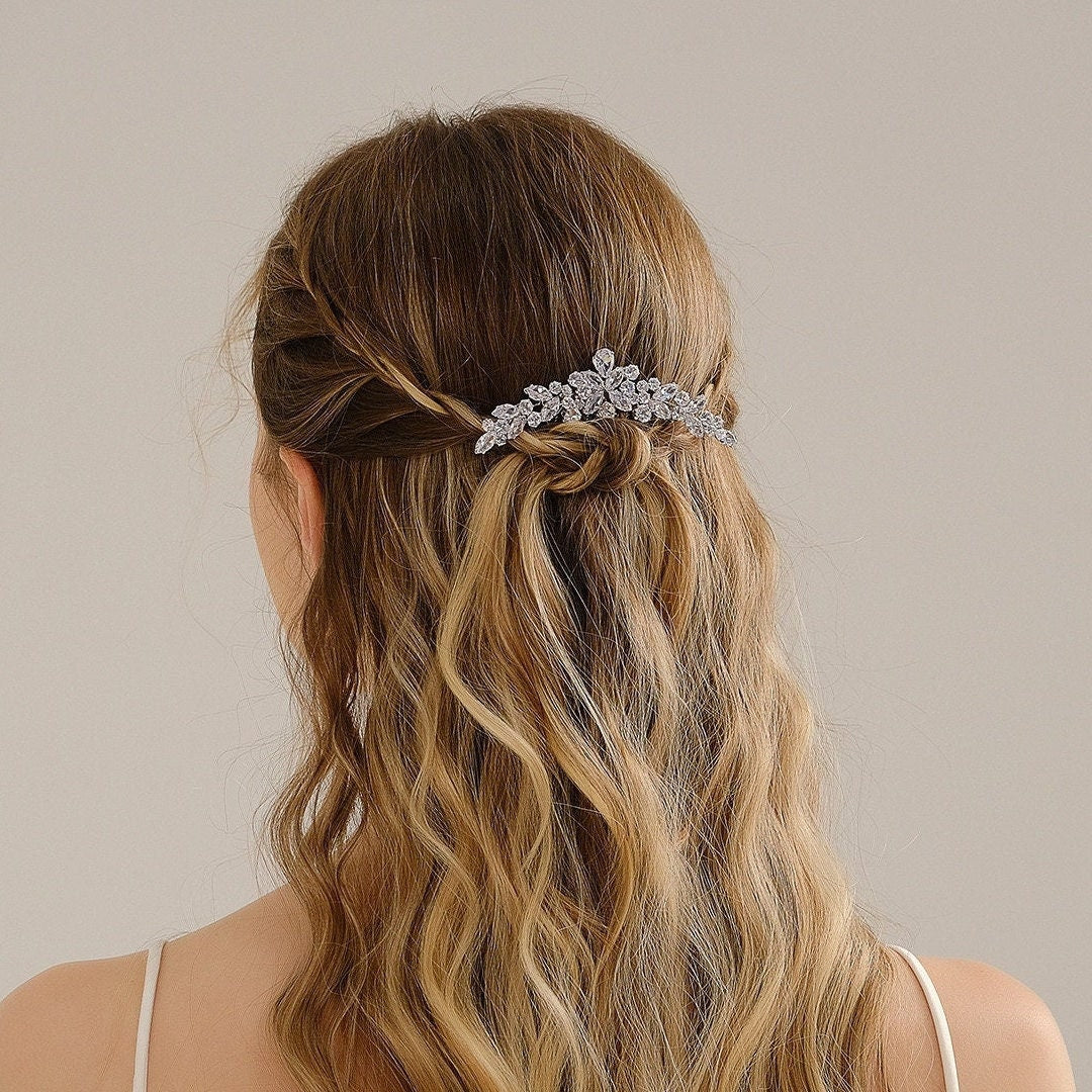 Sie können unseren Kristall-Haarkamm problemlos für verschiedene Frisuren verwenden, wie zum Beispiel eine Hochsteckfrisur, einen klassischen Dutt oder lockere Wellen. Sie können es an der Seite, am Hinterkopf oder am Oberkopf anbringen, wodurch es zu einem hübschen Blickfang wird, der die natürliche Schönheit der Braut hervorhebt und sie noch strahlender aussehen lässt.