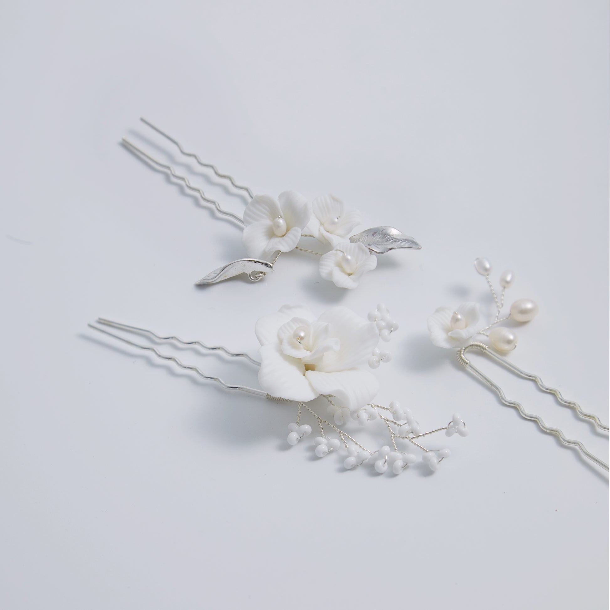 Jede Haarnadel verfügt über wunderschön handgeformte Porzellanblüten und zierliche Süßwasserperlen, die aufwendig angeordnet und mit vergoldetem oder versilbertem Draht fest verdrahtet sind. Das Ergebnis ist ein zeitloses und vielseitiges Haaraccessoire, das jede Brautfrisur ergänzt, von romantischen Hochsteckfrisuren bis hin zu wallenden Locken.
