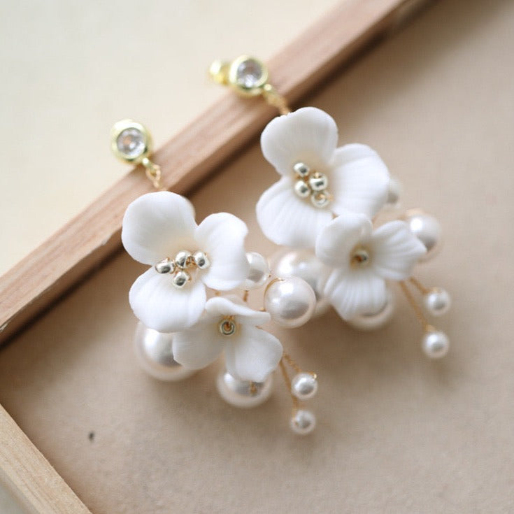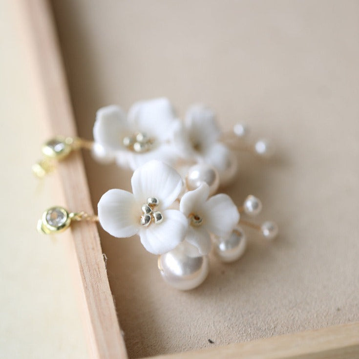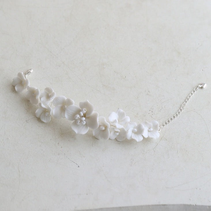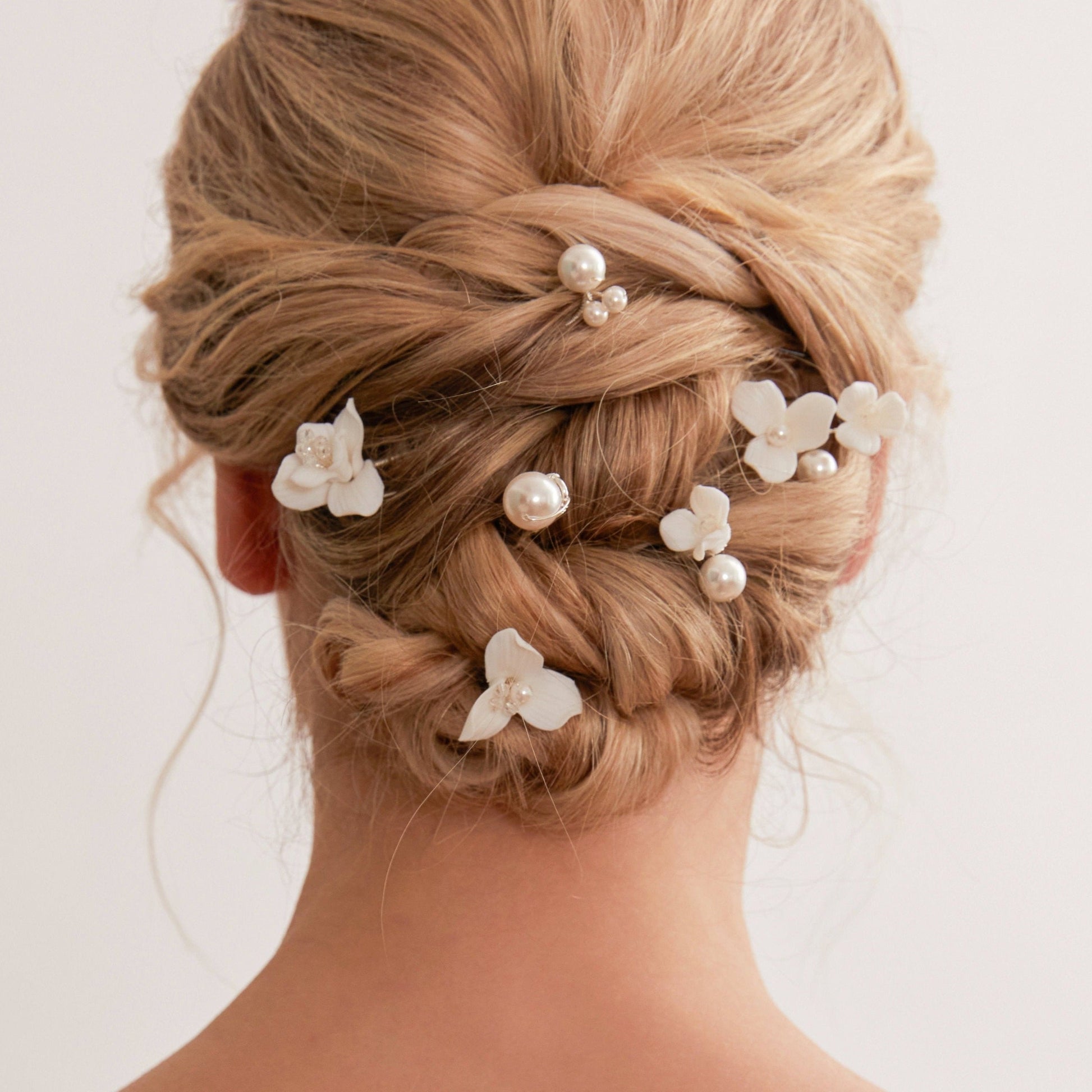 Jede Haarnadel verfügt über wunderschön handgeformte Porzellanblüten und zierliche Süßwasserperlen, die aufwendig angeordnet und mit vergoldetem oder versilbertem Draht fest verdrahtet sind. Das Ergebnis ist ein zeitloses und vielseitiges Haaraccessoire, das jede Brautfrisur ergänzt, von romantischen Hochsteckfrisuren bis hin zu fließenden Locken.