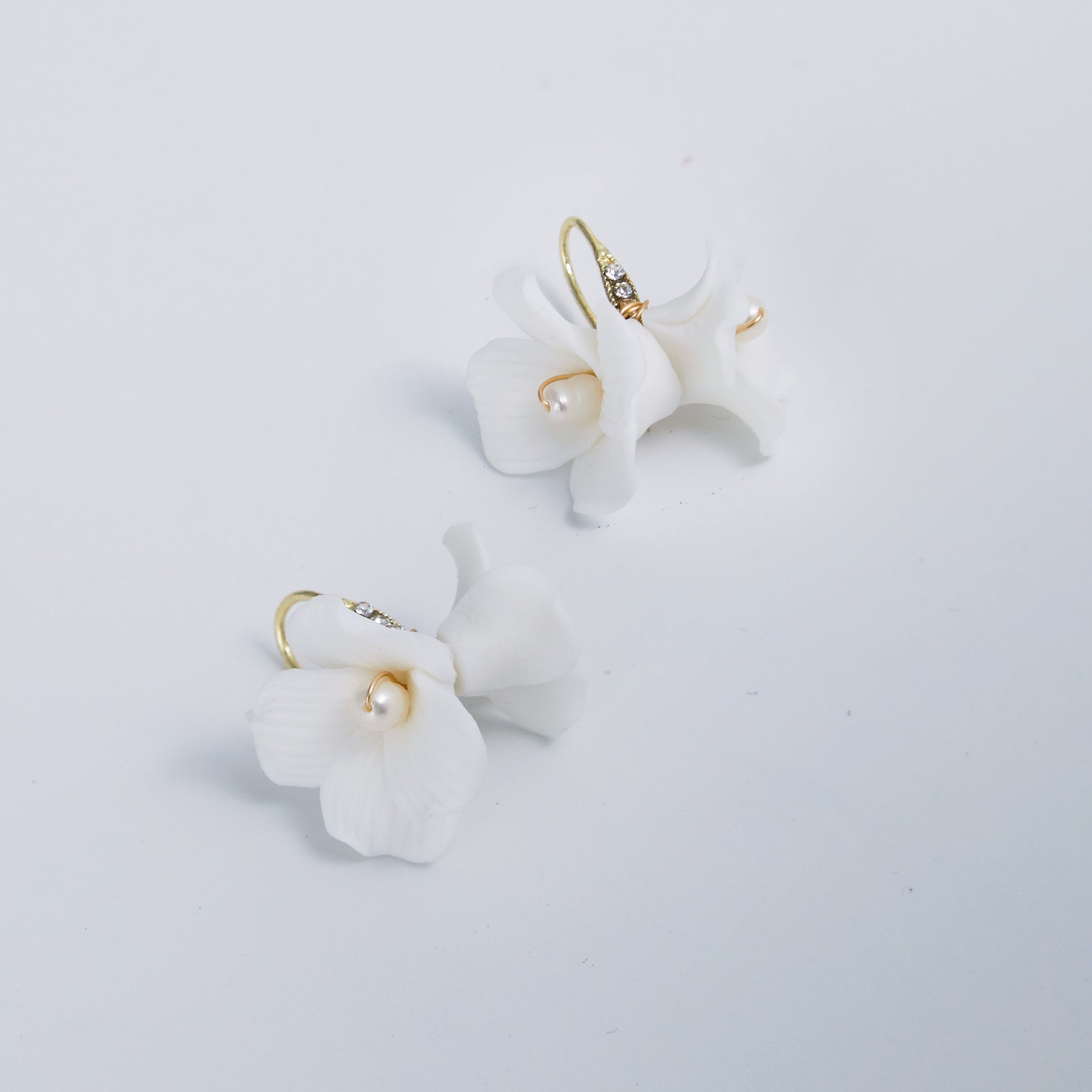 Vervollständigen Sie Ihr Brautoutfit mit unserem passenden Deluxe-Schleier und Blumenohrringen aus weißem Porzellan.