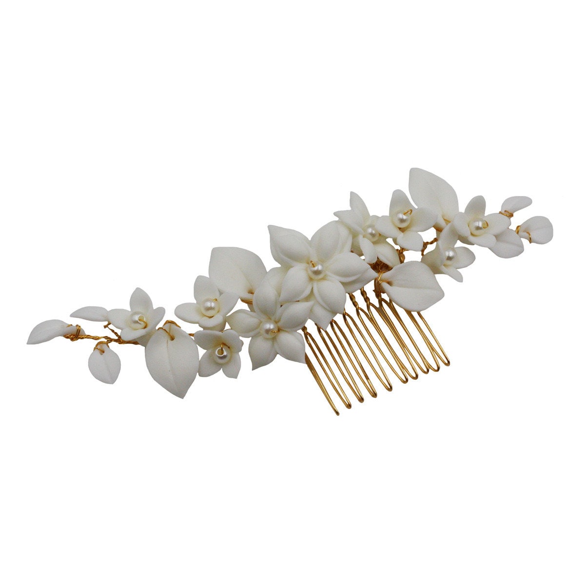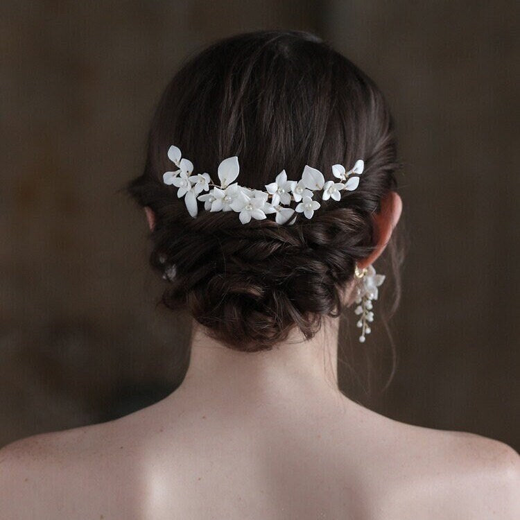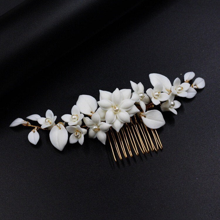 Ein herrlich romantischer, handgeformter Brauthaarkamm aus Porzellan. Hergestellt aus einem Arrangement aus individuell gefertigten Blumen und zierlichen Perlen. Dieser volle und strukturierte Haarkamm setzt ein Statement und fühlt sich dennoch unglaublich feminin an.