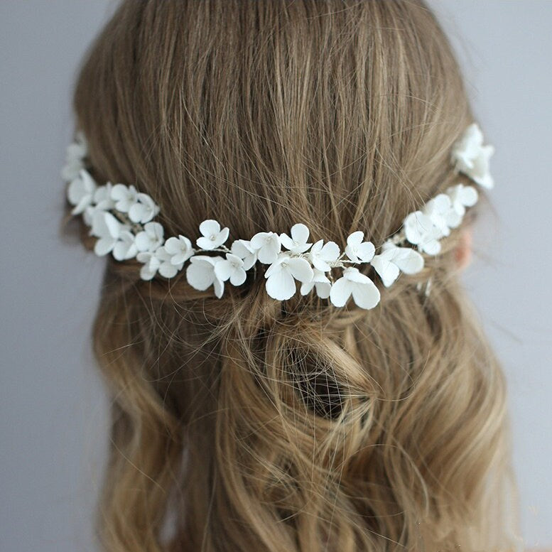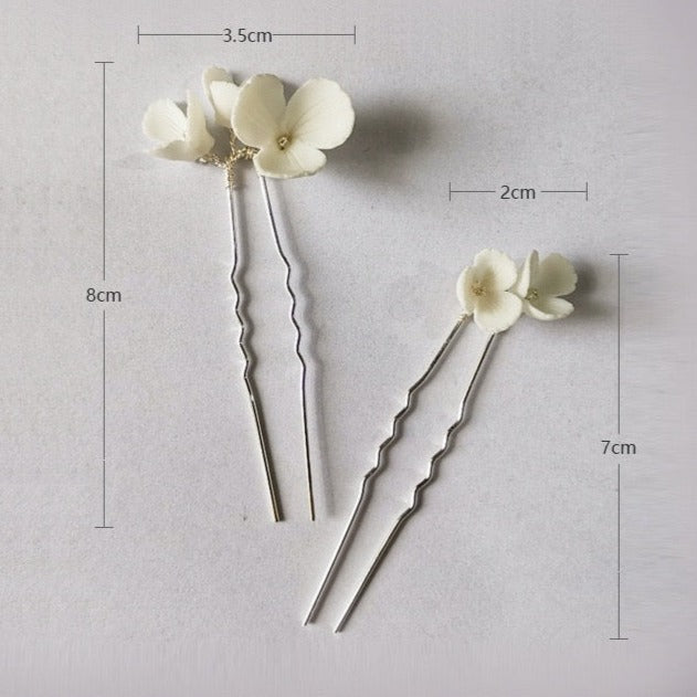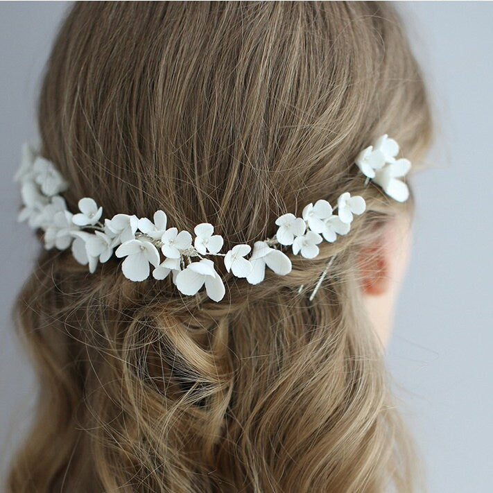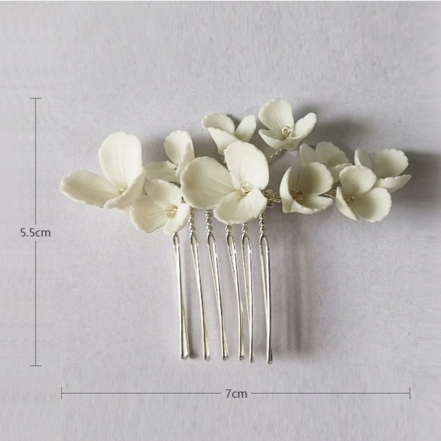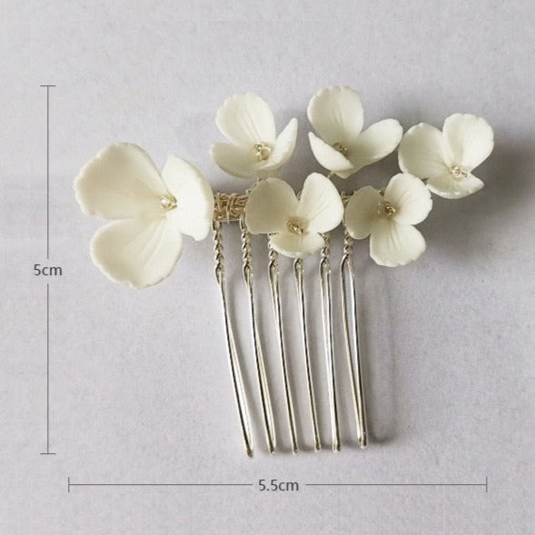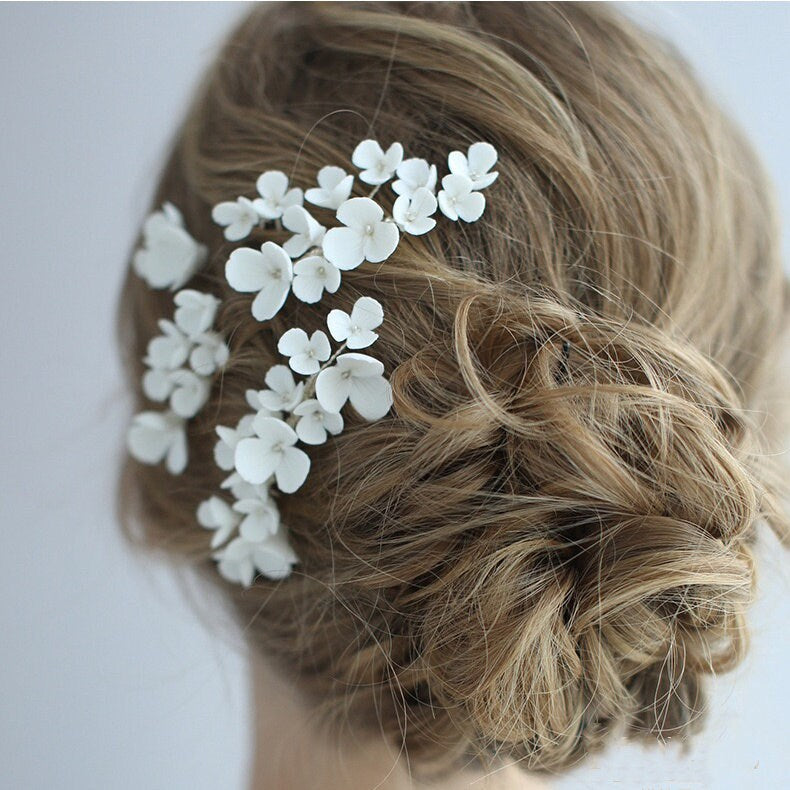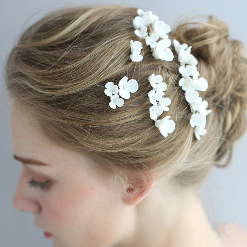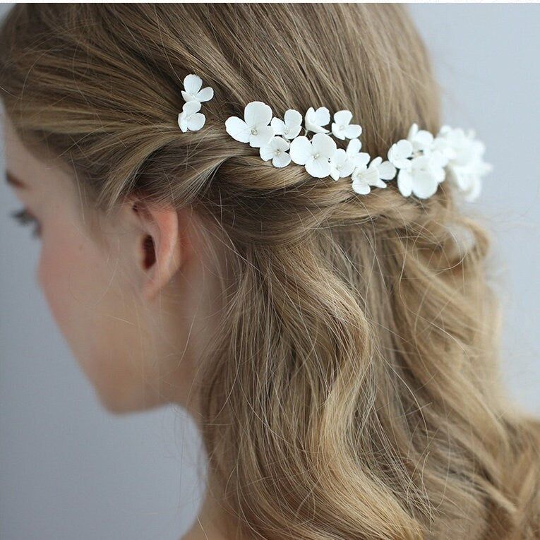 Dieses zarte Braut-Haarkamm- und Haarnadel-Set ist mit Liebe handgefertigt. Dieses Set enthält unterschiedlich große Kämme und Haarnadeln, mit denen Sie verschiedene Frisuren kreieren können. Die Hochzeitshaarteile sind mit wunderschönen Porzellanblumen verziert, die Ihrem Look einen Hauch Romantik verleihen.