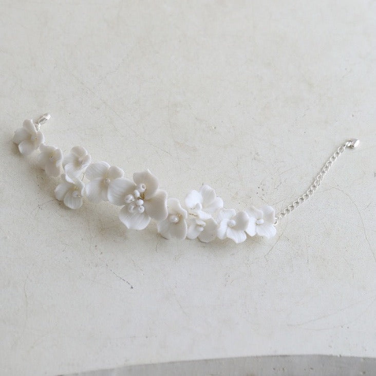 Diese zeitlosen handgefertigten Brauthaarnadeln verfügen über wunderschön handgeformte Blüten aus weißem Porzellan und Perlen. Perfekt für Bräute und Brautjungfern zum Tragen bei einem modernen Brautempfang oder einer Brautjungfernparty, aber Sie möchten es auch lange nach Ihrem Hochzeitstag tragen. Es kann auch ein Retro- und dennoch stilvolles Haaraccessoire sein, das Sie auf schicken Partys oder beim Ausgehen tragen können.