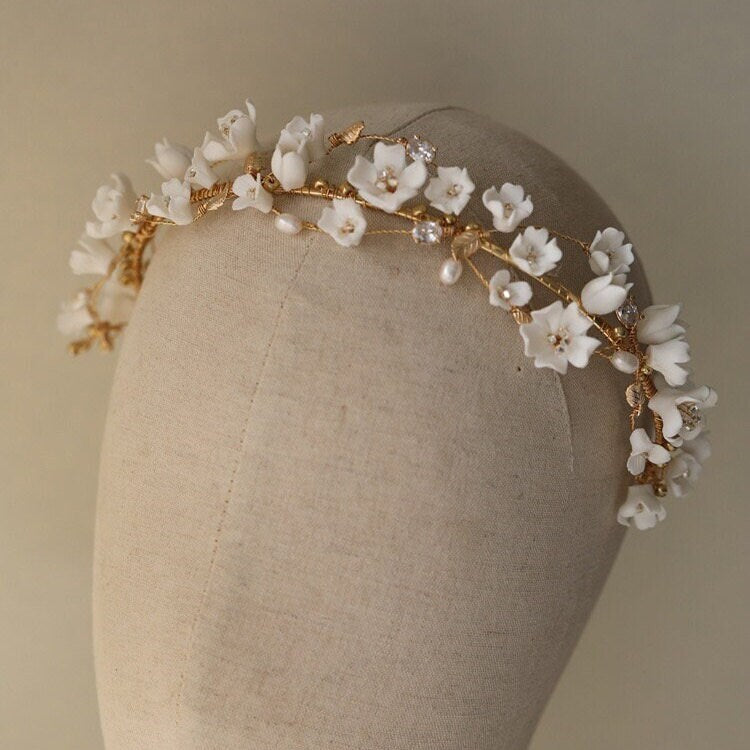 Add a touch of romance to your wedding day with our exquisite delicate white porcelain floral bridal headband. This beautifully hand-sculpted clay & pearl crown features individually crafted cherry blossom flowers, dainty freshwater pearls, and crystals. The result is a full, textured headband that makes a statement while remaining incredibly feminine.