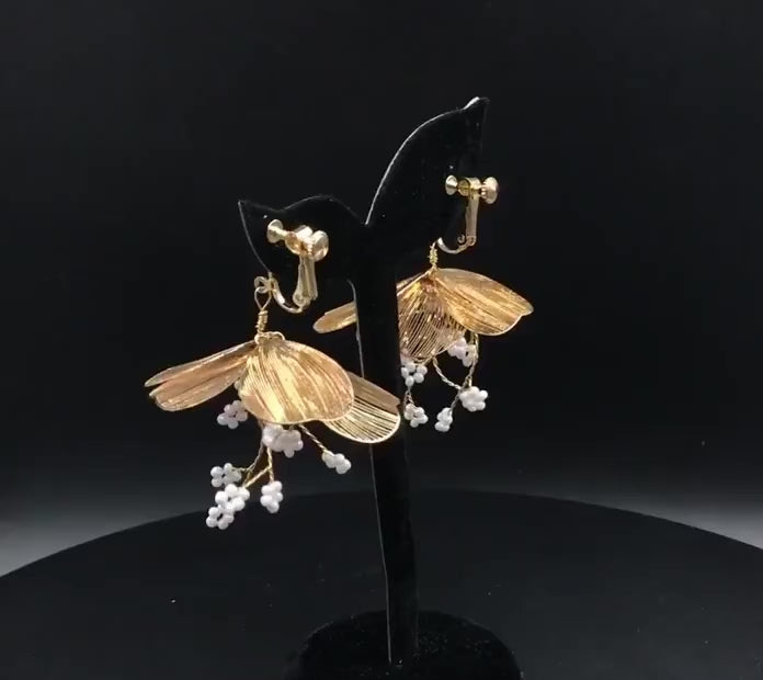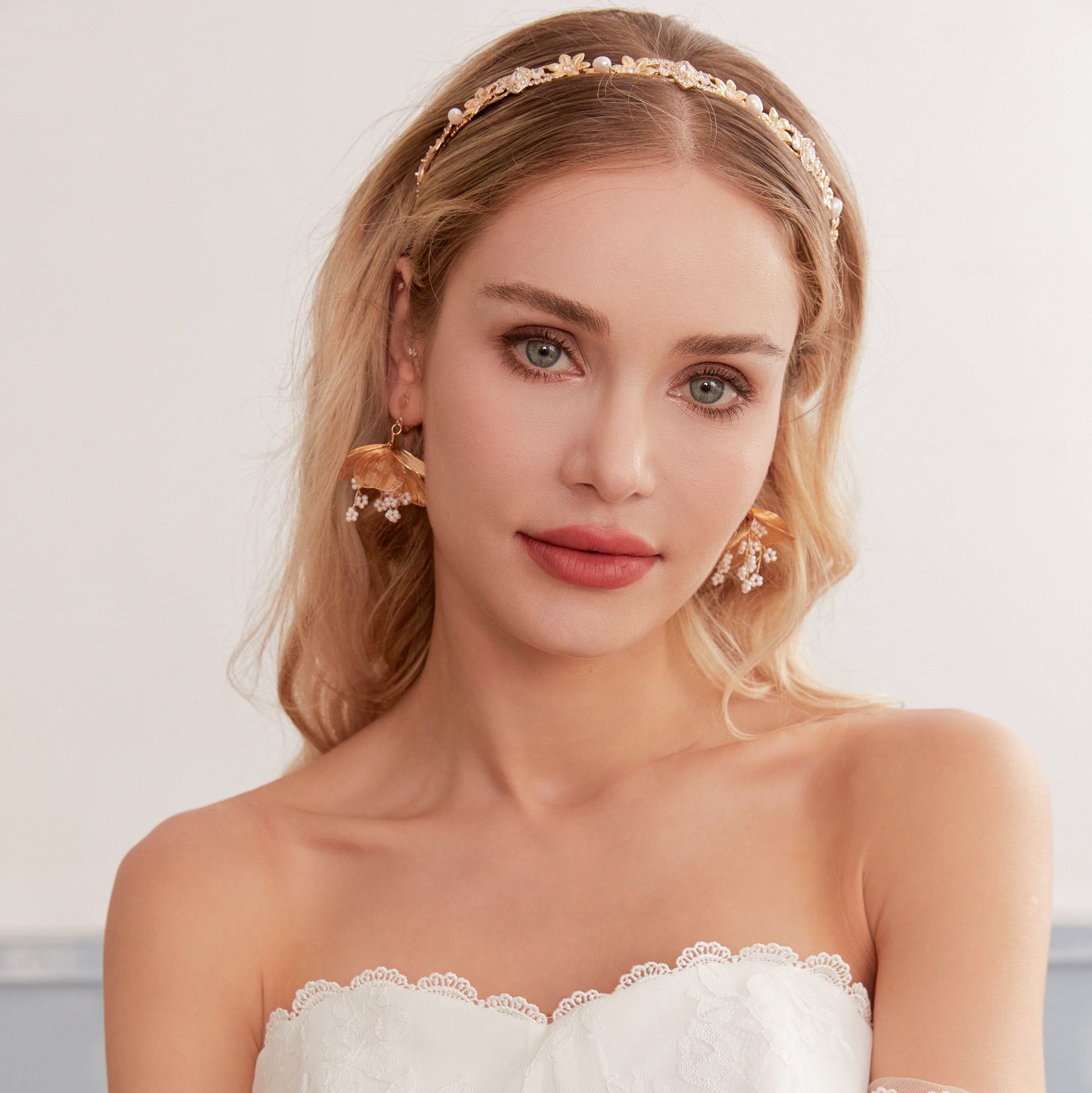 Handcrafted with romantic gold flowers, these bridal earrings feature delicate creamy hand-wired beads. These exquisite wedding earrings features unique 3D floral design and shimmering beads at the center of flowers. Complete your bridal jewellery set with our matching crystal gold headband.
