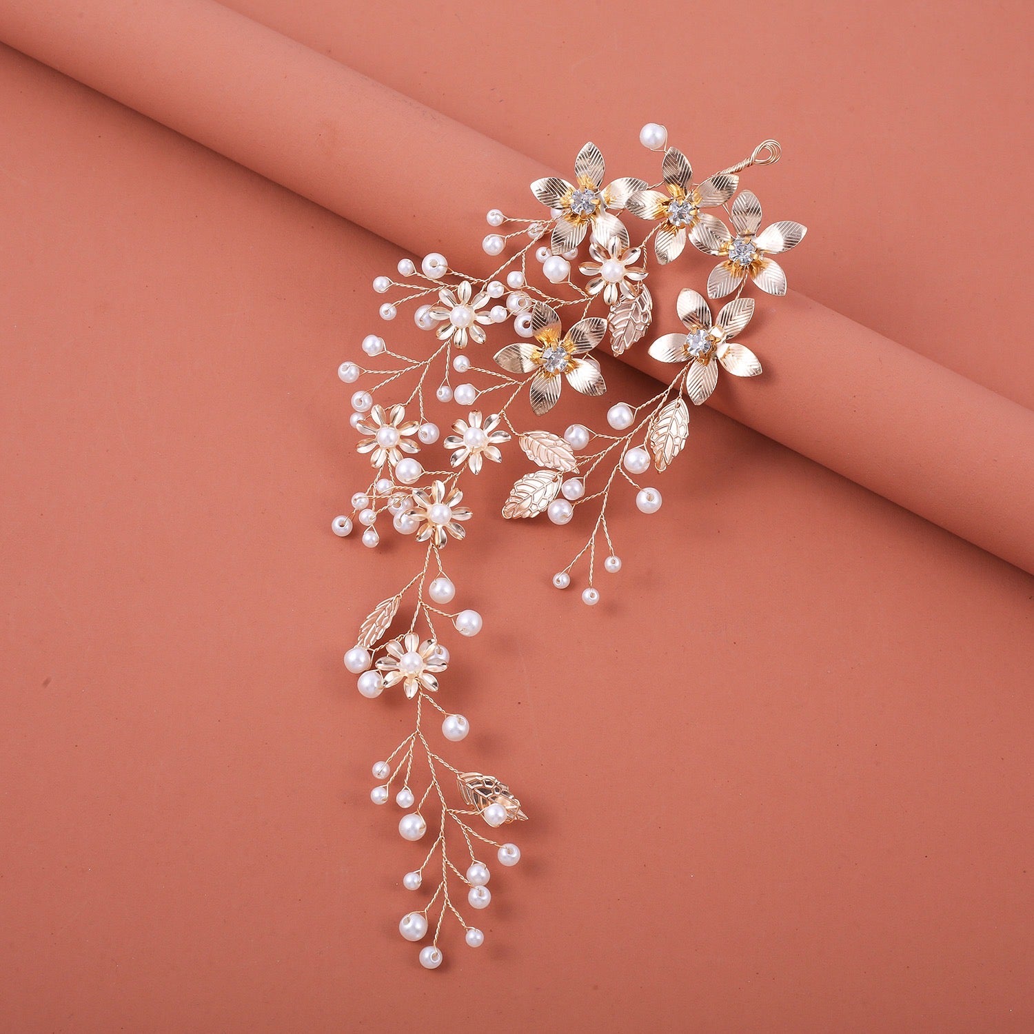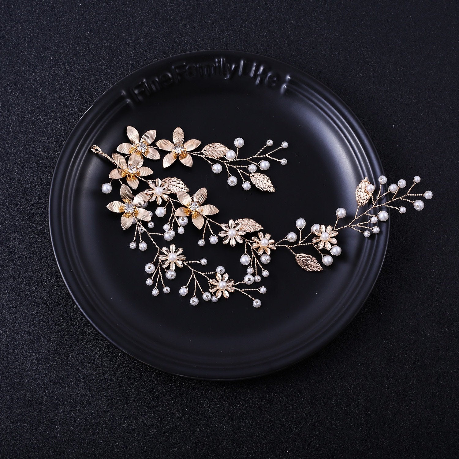 Handmade with long-lasting metal, the wedding hair piece is embellished with rhinestone, pearls and metal leaves detailing for a fairytale-inspired finish.