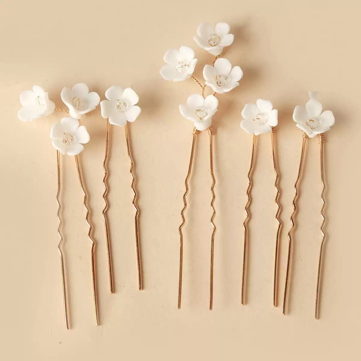 These timeless handmade bridal hair pins feature beautifully hand sculpted blossoms, made of white porcelain and pearls. Perfect for brides and bridesmaids to wear at a modern bridal reception or bridesmaid party, but you'll want to wear it long after your wedding day, too. It can also be a retro yet stylish hair accessory for you to wear at fancy parties or nights out.